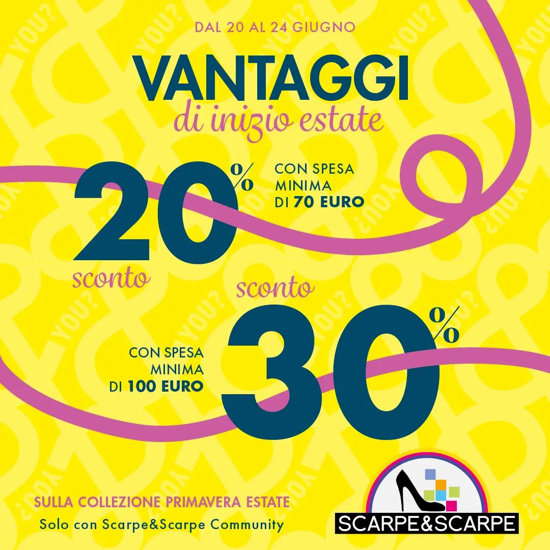 SCONTO 20% su spesa minima di 70€ e SCONTO 30% su spesa minima di 100€. Fino al 24 Giugno da Scarpe&Scarpe approfitta degli imperdibili SCONTI sulla Nuova Collezione (promozione valida con fidelity card “Scarpe&Scarpe Community”)! Ti aspettiamo nel nostro negozio!